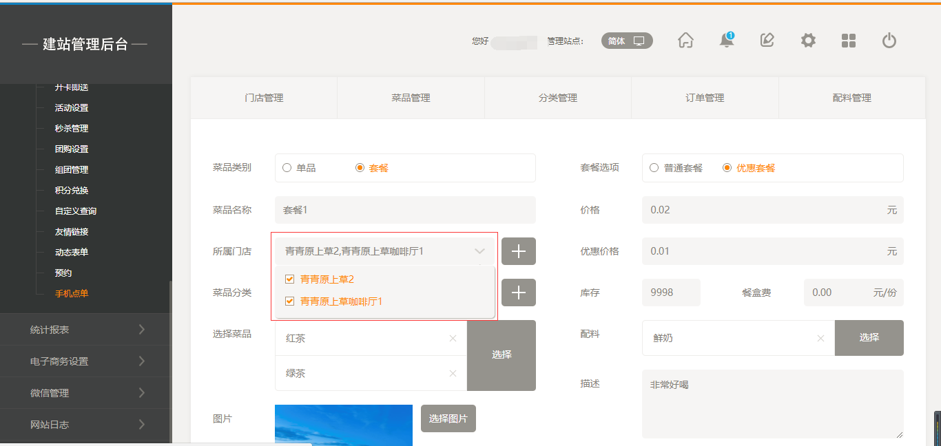 1.首先,点击“后台管理”-“手机点单”-“门店管理”-“添加门店”,填写完店面信息之后,我们点击保存即可(注:1.首先需要填写店面的地址然后可以拖动地图进行精确;2.店面最多添加30家店面),保存之后,我们添加菜品时有两个入口,一个是店面所对应的入口,一个是在菜品管理中可以选择所属店面,如图所示: